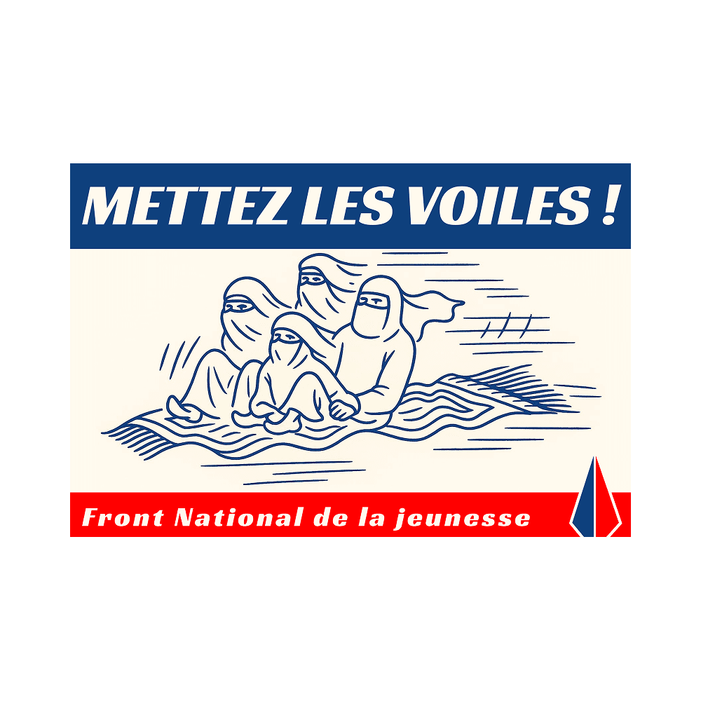 50 autocollants Mettez les Voiles, réédition d’un sticker du Front National de la Jeunesse, branche jeunesse du mouvement.